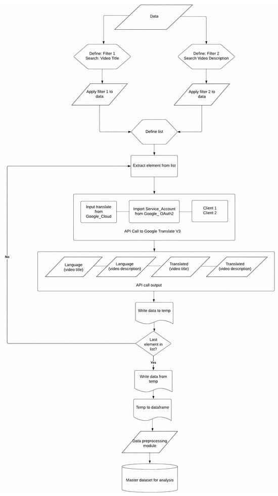 For performing the research work presented in this paper, the dataset developed by Knuutila et al. [84] was used. This dataset contains the metadata of 8122 YouTube videos that contained misinformation related to COVID-19. Furthermore, these videos were shared on different social media platforms between November 2019 and June 2020. The dataset includes the title and description of these videos. To add to this, the dataset also comprises information related to the sharing patterns of these videos on social media platforms such as Facebook and Twitter. For developing the master dataset for the tasks described in this research paper, the creation of four new attributes was necessary. These attributes represented the language of the video title, the language of the video description, the translated version (in English) of the video title, and the translated version (in English) of the video description. To generate these four attributes, Google Translate API V3 was used [85]. Figure 1 shows the step-by-step process that was followed in this regard for the development of the master dataset.