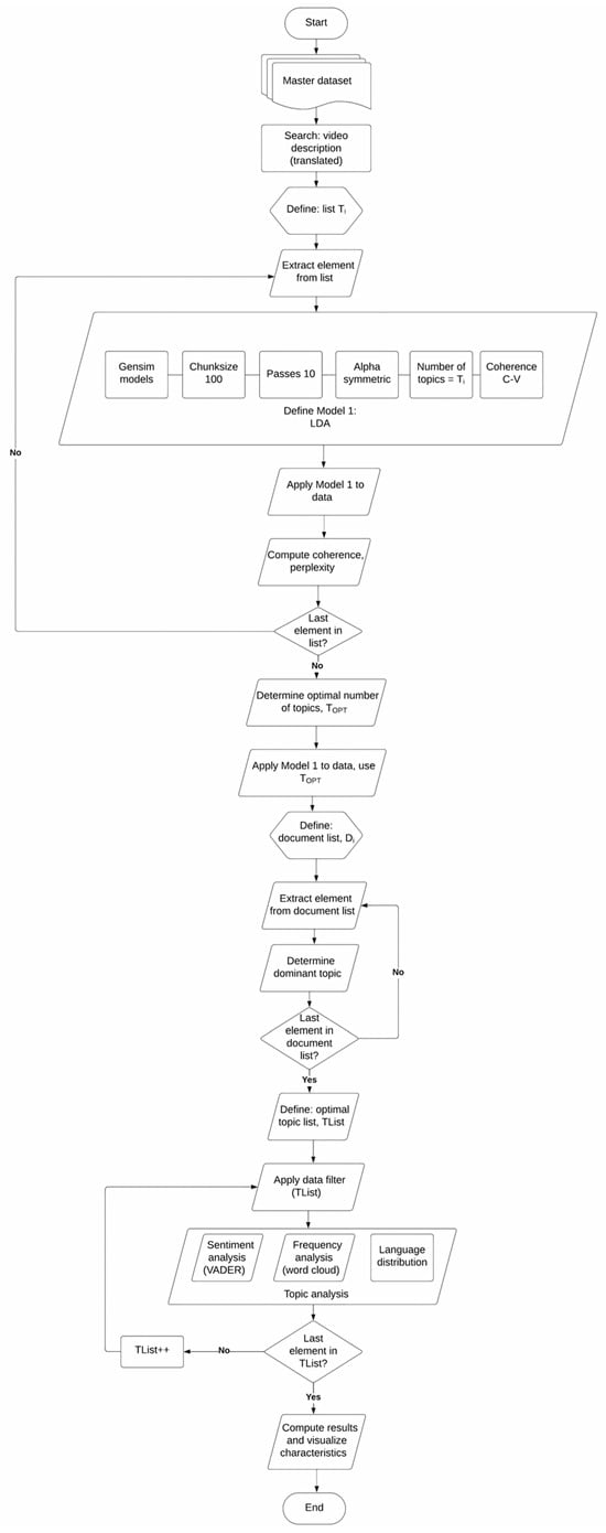 Thereafter, topic modeling using the Latent Dirichlet Allocation (LDA) approach was applied to the translated versions of the video descriptions. LDA [86,87] is a probabilistic model extensively used in natural language processing and machine learning for topic modeling, that aims to identify topics within a document collection. In the LDA framework, topics are generated through a uniform Dirichlet prior shared across all documents. The procedural steps [88] for constructing a corpus for an LDA are outlined as follows: