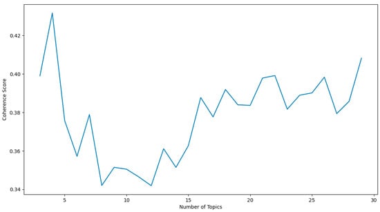 As can be seen in Algorithm 1, the data preprocessing was performed prior to topic modeling. The data preprocessing involved the removal of nonalphabetic characters, URLs, hashtags, user mentions, stop words, and numbers. It also involved the identification of English words using tokenization as well as the application of stemming and lemmatization. After performing data preprocessing, the missing values were addressed. There were multiple rows that presented missing values in the dataset either due to the video description being missing in the original data file or the video description in the original data file comprising only characters that were removed during data preprocessing resulting in a missing value. Such rows (a total of 1722) were removed from the dataset prior to performing topic modeling and related analysis to ensure that missing values for the video description were not considered as a separate topic by the topic modeling algorithm. This program computed the coherence score by varying the number of topics from 3 to 30. Thereafter, the variation of coherence scores for the number of topics was analyzed to compute the optimal number of topics in the available data. Upon determination of the same, the dominant topic for the video description was computed. The pseudocode of the program that was written in Python 3.11.5 to determine the dominant topic for the video description is shown in Algorithm 2.