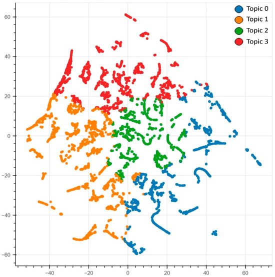 Thereafter, the visualization of the topic clusters in a 2D space was performed using the t-SNE (t-distributed stochastic neighbor embedding) algorithm. The result is shown in Figure 6.
