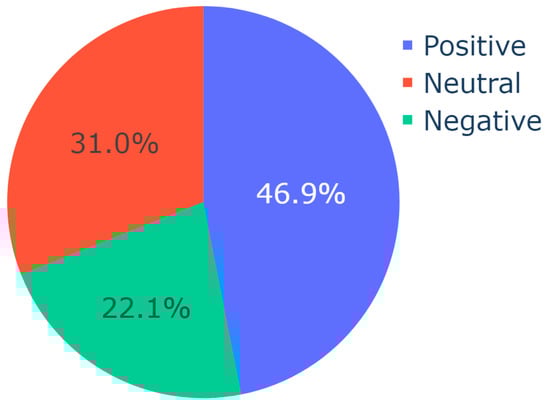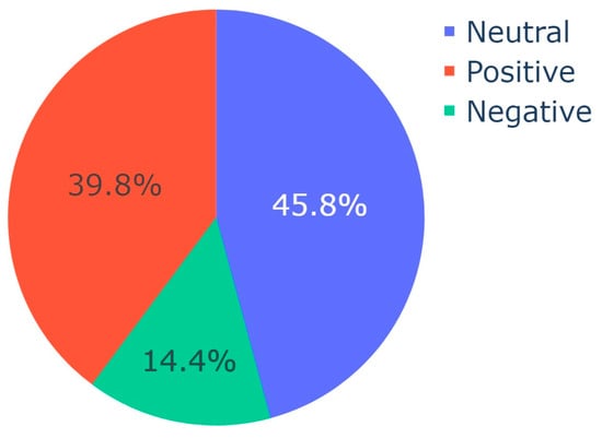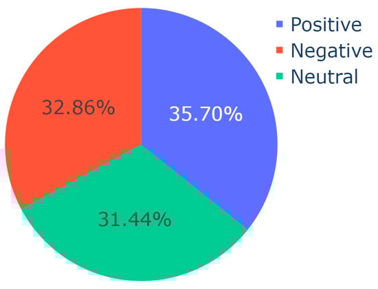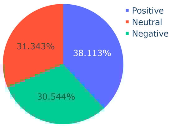 Then, sentiment analysis was performed for each topic. Sentiment analysis, also known as opinion mining, is the process of using algorithms to analyze and understand the attitudes, perspectives, and emotional expressions of people towards a certain subject. This subject may include a wide range of items, such as people, incidents, or concepts [91]. The phrases sentiment analysis (SA) and opinion mining (OM) are sometimes used interchangeably, indicating the same underlying meaning. However, multiple scholars have proposed nuanced differences between OM and SA [92,93]. Opinion mining is the process of extracting and analyzing people’s views on a certain subject. In contrast, sentiment analysis aims to detect and analyze the underlying sentiment expressed in something. Therefore, SA aims to discover viewpoints, analyze the emotions they express, and categorize these emotions according to their intensity. The classification process may be visualized as a hierarchical structure consisting of three tiers: document-level, sentence-level, and aspect-level sentiment analysis. The main goal at the document level is to classify a complete opinion document as either conveying a positive or negative viewpoint. In this context, the document serves as the main piece of data, usually centered on one broad topic or issue. The objective of sentence-level sentiment analysis is to categorize the emotion expressed in each sentence. The first stage is differentiating between subjective and objective phrases. For subjective statements, sentence-level sentiment analysis determines if they express positive or negative views [94]. Wilson et al. [95] emphasized that emotional articulation may not necessarily be subjective. Nevertheless, the difference between document- and sentence-level categories is not inherently substantial since sentences may be seen as succinct texts [96].