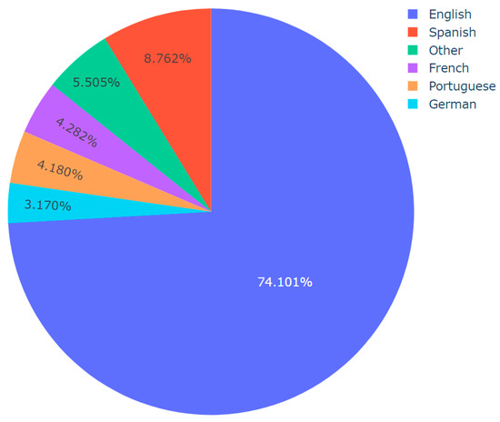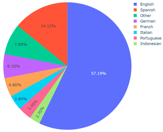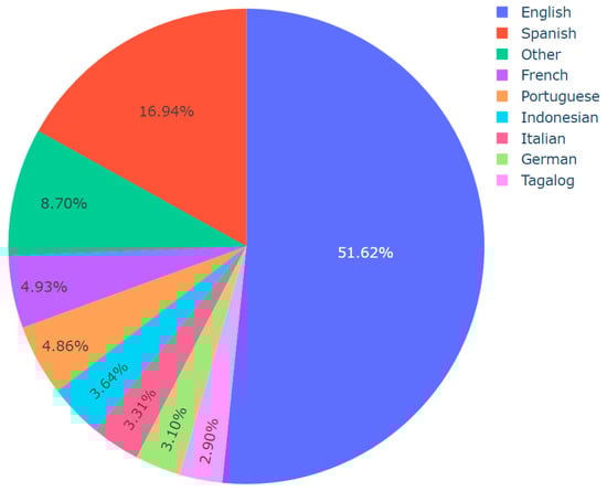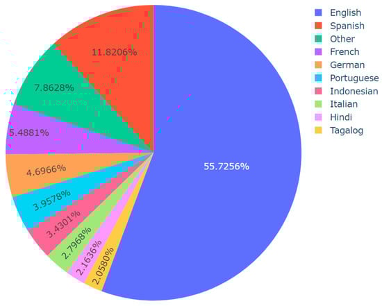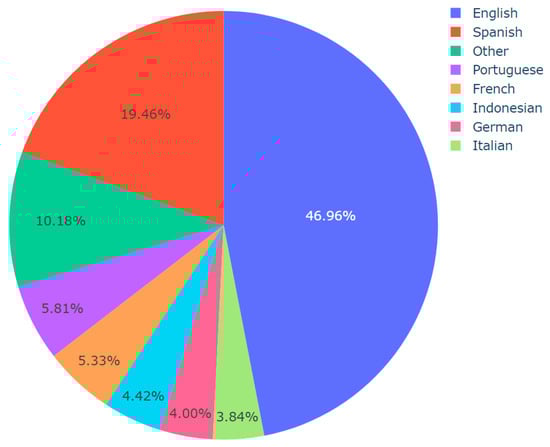 Then, topic-specific language analysis was performed by applying Algorithm 4 to the master dataset. The results of this analysis, shown in Figure 11, Figure 12, Figure 13 and Figure 14 revealed multiple novel insights regarding the usage of different languages for video descriptions in the context of videos containing misinformation about COVID-19. For instance, for all the topics, English and Spanish were the most widely used and second most widely used languages, respectively. It is worth mentioning that the video descriptions were available in a wide range of languages. So, for the generation of these results for each topic, those languages that were present in 2% or a lesser number of video descriptions were grouped together as the “other” category for clarity in visualization. Thereafter, minor updates were made to Algorithm 4 to compute the number of posts per language on social media platforms such as Facebook and Twitter. The data related to the number of posts on Facebook and Twitter were already available in the dataset. This information, along with the results of language analysis, was used to compute these results, which are presented in Figure 15 and Figure 16. For this analysis, once again, 2% was set as the threshold for the computation of the “other” category. In other words, all those languages that were represented in less than 2% of the total number of posts were grouped in the “other” category for the generation of these pie charts. The results from Figure 15 and Figure 16 reveal multiple novel insights. For instance, videos containing video descriptions in English were shared the highest number of times on Facebook and Twitter.