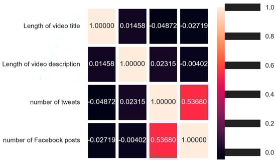 Finally, correlation analysis was used to analyze the characteristics of these videos. These characteristics included the length of the video title, the length of the video description, the number of Facebook posts, and the number of tweets. In a generic manner, a correlation coefficient is a quantitative measure of the degree of correlation, which refers to a statistical association between two variables. The variables may either refer to two attributes of a dataset of observations, often referred to as a sample, or two components of a multivariate random variable having a known distribution [101]. The methodology for the investigation of the correlation among these characteristics of the videos involved the computation of the Pearson correlation coefficient (PCC). The PCC is a statistical metric that quantifies the linear correlation between two sets of data. The PCC is calculated as the covariance divided by the product of their standard deviations. It provides a normalized value between −1 and 1, indicating the strength and nature of the relationship [102]. The pseudocode of the program that was written in Python 3.11.5 to determine the correlations between these characteristics is shown in Algorithm 5. The step-by-step working of this Algorithm is outlined in Figure 3.