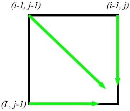 The main goal of pairwise sequence alignment is to identify regions of similarity that might indicate functional, structural, and/or evolutionary relationships between two pairs of biological sequences. Pairwise sequence alignment is divided mainly into two main types of problems: global alignment and local alignment. Many approaches have been used as dynamic programming algorithms to compute a global alignment of two sequences such as the Needleman–Wunsch algorithm []. The NW algorithm utilizes a dynamic programming algorithm to find the global alignment between a pair of sequences. It works as follows. Consider that we are aligning two sequences, A and B, each of length N characters. A two-dimensional array of size (N + 1) × (N + 1) is created. The value of each cell in this array is computed based on three other values in the array, as shown in Figure 1. Specifically, the optimal value at cell , denoted by , is computed using the following Equation (2):