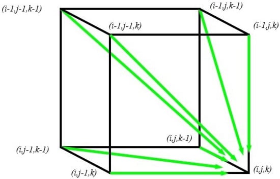 In addition to the previously mentioned approaches, several parallelization strategies have been employed to tackle the challenges associated with MSA []. Some of these strategies focus on the parallelization of dynamic programming algorithms, such as in []. Other strategies aim to parallelize the progressive alignment []. Several studies focus on the parallelization of heuristic algorithms, such as []. Recently, many studies utilized GPU acceleration for MSA []. The optimization of parallel MSA is characterized by continuous innovation in algorithmic design and adaptation to emerging hardware architectures []. In our study, we employ various parallel computing approaches to enhance the basic dynamic programming approach for MSA, as shown in the next Section 3.