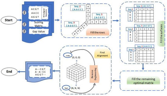 Limited studies have been directed towards seeking exact solutions for multiple sequence alignment due to the time complexity associated with obtaining the optimal results. Mojbak et al. [] proposed an exact-MSA approach using forward dynamic programming. Also, in the comprehensive exploration of exact solutions, Hosseininasab et al. [] proposed a framework employing a dynamic programming approach to construct a multivalued decision diagram, representing all PSAs. The synchronization of PSAs with the proposed decision diagram effectively incorporates modeling the MSA problem within polynomial space complexity. Moreover, Domínguez [] delves into statistical and biological concepts employed in the MSAProbs-MPI tool to complete the alignments where high-performance computing techniques are employed for alignment acceleration. Additionally, Ju et al. [] introduced an end-to-end deep neural network and called it CopulaNe, designed to directly estimate residue co-evolution from MSA, representing a cutting-edge approach in the finding of exact solutions for MSA.