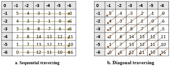 In the Needleman–Wunsch algorithm, the value of a cell is calculated based on three value cells (left, upper, and left), as shown in Figure 4. Hence, filling the matrix is performed with data dependency between cells. There are two ways to fill the matrix: sequential or diagonal traversing methods. In the sequential traversing approach, as in [], the algorithm starts from the cell with index (1, 1), (1, 2) and continues until it reaches cell (1, N), as shown in Figure 5a. Then, it moves to the next row using the same approach, while the diagonal traversing method works by filling cells diagonally simultaneously. Figure 5 shows the difference between sequential traversing (a) and diagonal traversing (b).