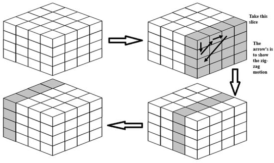 To solve the three-sequence problem, we work in three different ways to solve this problem: Firstly, we assume that the created array represents three sequences from a cube, and this array is processed as shown in Figure 6. We take a slice of the cube and treat it as a 2D array. Then, we process this 2D array in a zig-zag fashion. The zig-zag fashion is shown in Figure 6 and marked in dark arrows. We re-try the process until we complete the whole matrix. Note that every cell in this matrix represents a block (a group of cells).