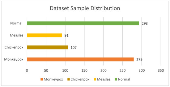 The experiment for classifying monkeypox was conducted using the Monkeypox Skin Image Dataset (MSID). This dataset, sourced from Kaggle (https://www.kaggle.com/datasets/dipuiucse/monkeypoxskinimagedataset, (accessed on 1 December 2023)), comprises images of human skin, representing four distinct skin diseases: monkeypox, chickenpox, measles, and uninfected skin, as presented in Figure 2. Within the dataset, a total of 279 instances of monkeypox were identified, along with 107, 91, and 293 instances of chickenpox, measles, and uninfected skin, respectively. In total, the dataset comprises 770 images. Originally, the images in the dataset were in PNG format with a resolution size of 224 × 224 pixels in RGB.