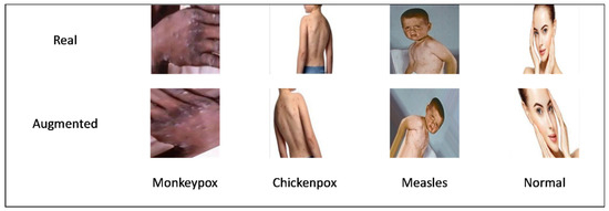 In order to expand the number of dataset samples for each class, data augmentation is performed on the training samples. Additionally, data augmentation keeps the model from overfitting, and helps to make it more resilient. This popular method is used to expand the number of samples that are automatically generated by using various image transformation methods, including cropping, translation, rotation, shearing, mirroring, and vertical and horizontal flipping. In order to partially balance the dataset samples for each class, four data augmentation techniques, brightness, rotation, zooming, and shear, are applied to the dataset in this study, as presented in Figure 3. The images in the monkeypox, chickenpox, measles, and uninfected classes are augmented by factors of 2, 5, 7, and 2, respectively. Since the measles class has the fewest images, it has undergone the most augmentation. Table 1 also summarizes the total number of samples for each class in the training set before and after the augmentation.
