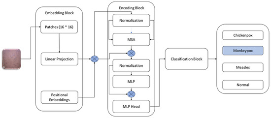 This section presents the ViT framework, emphasizing its key concepts, organization, self-attention mechanism, multi-headed self-attention, and the mathematical foundations that informed its development. In 2020, the ViT—a deep neural network architecture—was first introduced, and was specifically designed for image recognition tasks [25]. It expands the transformer architecture, which was initially developed for natural language processing through the use of the innovative notion of viewing images as sequences of tokens, which are frequently represented by image patches. ViT uses the transformer design’s capabilities to handle these token sequences efficiently. Notably, ViT’s transformer design has proven to be broadly applicable and effective, as shown by its successful application to a range of tasks, such as object identification, image restoration and identification [26,27,28].