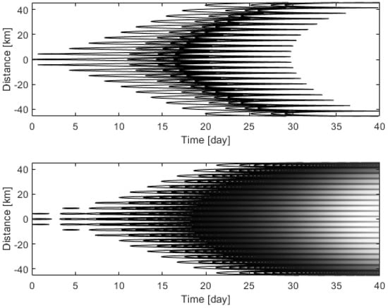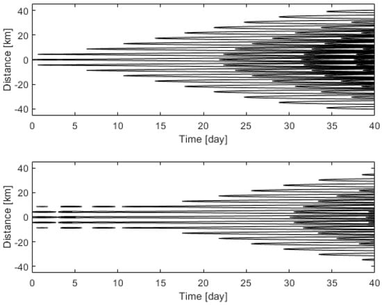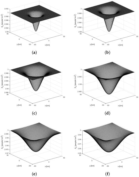 The model’s approximated solutions, contour plots, and rejected stepsize h are depicted in Figure 1, Figure 2, Figure 3, Figure 4, Figure 5, Figure 6 and Figure 7. Since the incubation period of the disease lasts for three days, the density of susceptible individuals and the density of nonisolated infectious individuals will not change for After this time, when the density of susceptible individuals starts to decrease, while the density of nonisolated infectious individuals starts to increase, as demonstrated in Figure 2, Figure 3, Figure 6, and Figure 7. Clearly, Figure 6 and Figure 7 show less severe epidemic outbreaks, since the force of the containment measures is applied to half of the infected population, i.e., On the other hand, when the disease moves faster and quickly reaches the boundary of the infected area, as shown in Figure 2 and Figure 3.
