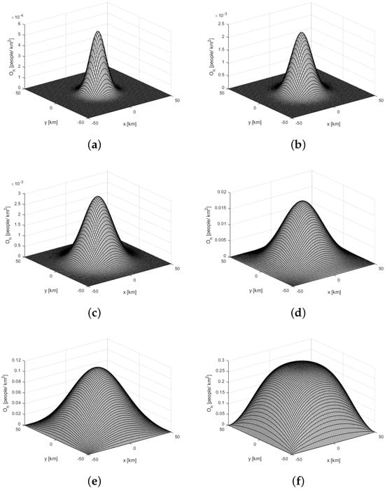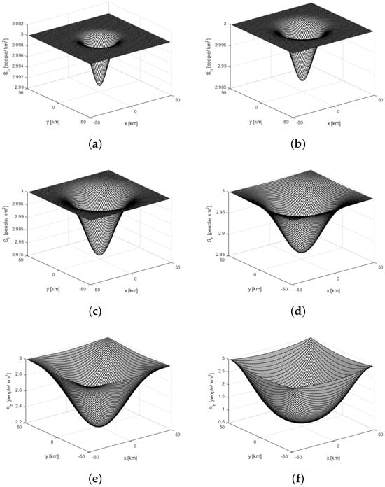 The coronavirus disease (COVID-19) emerged in Wuhan, China in December 2019. The disease is registered as an epidemic in many regions of the world. In this section, we use the model described in Section 2 to study the spread of COVID-19 in two-dimensional space for two cases. In the first case, we assume that no containment measures are applied; thus, For the second case, we assume that the force of containment measures is We assume that and Also, we assume no deaths for the infected individuals in the latent period, i.e., [1/day]. The other numerical values of the parameters are given in Table 1.