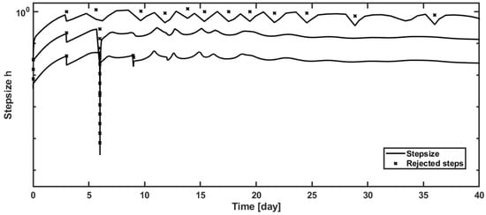 If is rejected, another attempt is taken with a halved stepsize [,]. In Figure 4, we demonstrate the number of rejected steps for different values of , , and Figure 4 depicts that is associated with a higher number of reject steps.