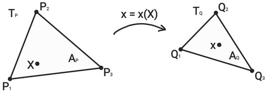 For the approximate solution of Equation (2) we use the hyperelastic nodal force version of the finite element method [,,]. For the reader’s convenience, we briefly review its membrane variant in terms of the Laplace stretch []. We consider the deformation of a consistent triangulation of the initial planar configuration . A triangle with vertices deforms into a triangle with vertices via mapping , rf. Figure 1. The Jacobian of the deformation is , where is the area of the undeformed triangle and the area of the deformed triangle . If are the barycentric coordinates of a material point , then for and , it holds