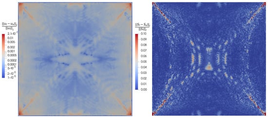 Distribution of relative differences in displacements and stresses for the fine mesh and the dimensionless pressure . The Euclidean norm is used for the evaluation of displacements, the Frobenius norm is used for the evaluation of stress tensors. The subscript f denotes the finite element reference solution and the subscript e denotes the data-driven forward simulation solution.