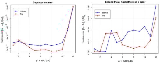 The distribution of the relative differences in displacements and stresses for the fine mesh and the dimensionless pressure are shown in Figure 5. The Euclidean norm is used for the evaluation of displacements, the Frobenius norm is used for the evaluation of stress tensors. The integral relative errors for both meshes and for various dimensionless pressures are shown in Figure 6.