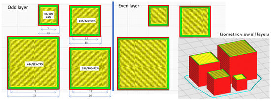 For the fabrication of PLA cubes, a common desktop printer, the Prusa i3mk3 (Prusa3d, Prague, Czech Republic), was used to maximize the reproducibility of this research. Filament was purchased from Amazon Basics PLA (filament diameter: 1.75 mm; roll weighing 1 kg). Slicing was performed using Ultimaker Cura 4.8.0 with a 100% infill with ±45° lines and layers of 0.2 mm. Figure 1 shows odd and even layers of the slicing. An isometric view with slices of all layers is also provided. The colors indicate the outer skin (red), closed contour (green), and 100% infill (yellow). As we fixed the number of outer-skin pieces and closed contours, the percentage of infill was lower for smaller parts. For L = 10, only 49% of the cross section is infilled, with just 13 connection points between infill and closed contour. This reduced number of contact points could result in a lower stiffness. For the small cube for which L = 10 mm, a total number of 50 layers were required (10/0.2), while for a large L = 25 mm cube, a total number of 125 layers were necessary (25/0.2). For each cube size, a total of 20 specimens were fabricated. The time and grams required to fabricate each cube, according to Ultimaker Cura, are presented in Table 1.