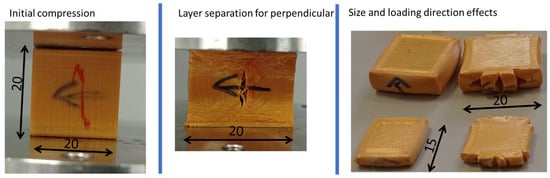 Figure 2 depicts the setup of compression test at the initial stage, once layer separation was evident, and a comparison of loading direction and two different cube sizes after load removal.