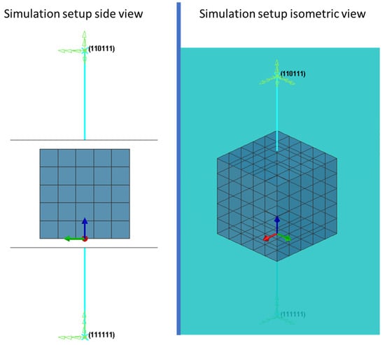 The cube was simulated with 125 (5 × 5 × 5) perfect solid cube elements with 6 × 6 × 6 = 216 nodes each. Top and bottom plates were simulated using a large shell element connected to a rigid body. This step was executed to ensure that the material used in the compression tests was not deformed compared to our PLA cubes. The center of gravity for each rigid body was constrained as a boundary condition to avoid any displacement or rotation. Only the z displacement (3rd direction) was set to be free for the moving plate.