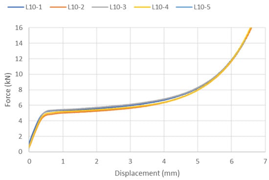 The first objective was to verify the repeatability of all the compression tests in order to obtain the values of forces with a normal distribution. The samples with more dispersion in the results were the smallest cubes with a size of L = 10 mm, for which tolerances have a larger influence. In Figure 4, up to five different tests are shown, exhibiting very similar behavior. The standard deviation for forces was calculated, yielding in the worst case ±3.6%.
