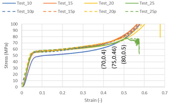 The second objective was to check if the orientation of loading according to fabrication was important and if we could scale our specimens to use the same stress–strain curve. Figure 5 shows four tests concerning fabrication direction and four tests concerning a perpendicular direction (named Test_10p, Test_15p, Test_20p, and Test_25p). All the force–displacement curves were converted to stress–strain curves for comparison. Only the smallest specimens for which L = 10 mm in the fabrication direction showed a different behavior. All the other specimens were very similar. The biggest specimen, with a size of L = 25 mm (A = 625 mm2), showed a plateau at around 80 MPa. This is because 80 × 625 = 50,000 N = 50 kN was the maximum force allowed by the tensile test machine.