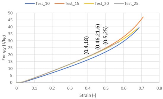 The integration of force displacement for all the tests allowed us to create a unique energy density curve for compression strain as shown in Figure 6. For 40% compression, it was found that PLA cubes could withstand 18 kJ/kg or 21.6 J/cm3 (1 cm3 = volume of basic cube with L = 10 mm = 1 cm). For 46% compression, it was found that PLA cubes could withstand 21.6 kJ/kg or 25.92 J/cm3. For 50% compression, it was found that PLA cubes could withstand 25 kJ/kg or 30 J/cm3.