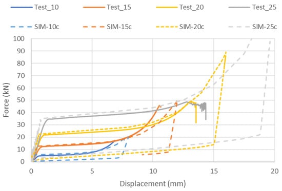 Force-versus-displacement curves for experimental tests and compression simulations for L = 10, 15, 20, and 25 mm.