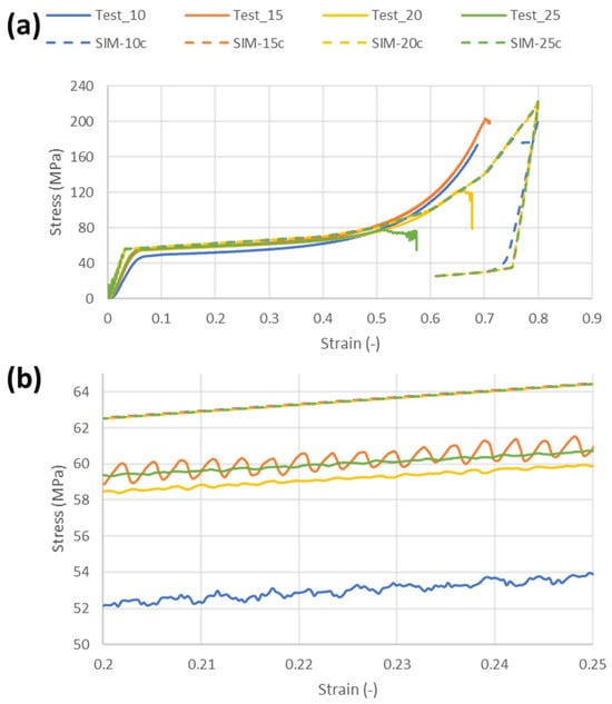 Stress–strain curve from experiments and compression simulation: (a) full scale and (b) detail for 20–25% strain.