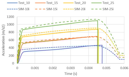 The fourth objective was to demonstrate that with average values of acceleration, we can estimate impacts, but we require the complete integration of experimental force–displacement curves to obtain a real estimation of acceleration and time during impact. Figure 9 shows the acceleration curves estimated from the experimental force–displacement curves compared with those obtained from simulations. There is an agreement in the estimation of the maximum acceleration level, with the simulations slightly overestimating these values. It should be noted that the compression experiments did not consider the unloading path; therefore, the experimental estimation is only able to predict acceleration levels up to the maximum value of acceleration, when unloading should start.