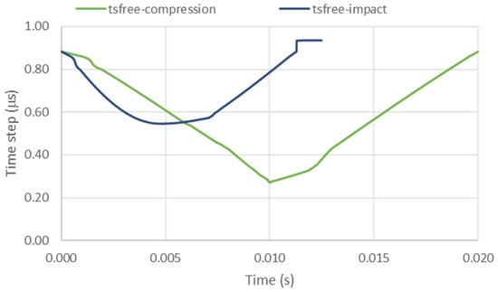 Time step control provided simulations with accurate estimations of acceleration with CPU time reduced to around 31%, as shown in Figure 10. This is a critical point in explicit simulations as a compressed element reduces its length and therefore reduces the time step used for all the simulations. The evolution of the free time step is shown in Figure 11. Fortunately, the good agreement between theory and experiments allowed a good dimensioning of the size of the cube sample to be used. If by mistake a smaller sample size was chosen, then more compression would be induced, and the time step would decrease to a point where we could not attain results in a reasonable time. Superimposing a time step by means of mass scaling is risky. In this case, we increased the mass of the cube by a factor of 90, from 1 to 90 g. For our impact tests, this was almost negligible, as we applied an impact of 16 kg and therefore obtained good agreement in acceleration.