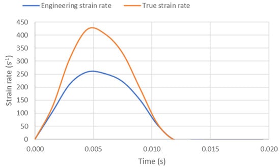 The seventh objective was to validate this methodology for large strain rates. In impacts, the cube was compressed to around 5 mm (50% = 0.5 engineering strain) in about 5 ms = 0.005 s, which is an average strain rate of 100 s−1. However, impact tests are not carried out at a constant strain rate. Simulations of this impact allow for the plotting of the engineering strain rate and the true strain rate. The engineering strain rate assumes that the final compression from 4.9 to 5 mm implies a 0.1/10 = 0.01 strain, as the original length of the cube is used. True strain considers the part to be of a real length, calculated as 0.1/5 = 0.02 true strain. Therefore, in large compression, true strain is larger than engineering strain. To calculate explicit finite elements, their updated geometry is used after each time step, providing a true strain rate. Figure 12 shows the strain rate during an impact with a cube for L = 10 mm, m = 16 kg, and v = 1.8 m/s, resulting in 50 J of energy being absorbed.