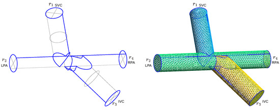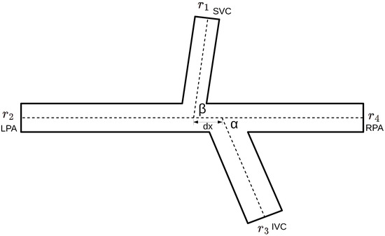 3D models of blood flow allow clinicians to test a variety of vessel configurations and flow conditions. They allow the minimization of pulmonary and TCPC resistance, the energy dissipation in the TCPC, balance the hepatic and total flow distribution between the right and left lungs, and avoid regions with excessive or low wall shear stress. Local three-dimensional blood flow modeling is often used to solve such problems [2,3]. The junction of the inferior and superior vena cava (IVC and SVC) and the left and right pulmonary artery (LPA and RPA) forms the domain of integration. A fast evaluation of hemodynamic parameters without solving complex Navier–Stokes equations is desirable.