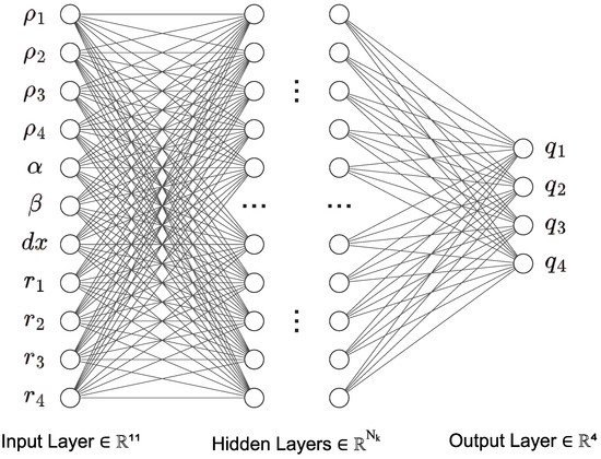 In this section, we develop a FFNN designed to predict the values of the input and output flows (, , , and ) based on the geometry of the junction and the pressure values (, , , and ).