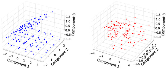 In the second case, the Latin hypercube sampling method was used. When using this method, the required number of final samples and parameter intervals are specified. We generated 100 meshes using this method. Then, also using the Latin hypercube method, 50 pressure combinations were generated for each mesh to calculate the flows. Finally, samples of data were generated by the second method. In contrast to the conventional grid search method, Latin hypercube sampling (LHS) was anticipated to augment the diversity within our dataset. To elucidate the distinctions between the acquired datasets, we employed principal component analysis (PCA) [24] to reduce their dimensionality. The visual representation (refer to Figure 4) substantiates the superior dataset diversity achieved through the utilization of LHS.