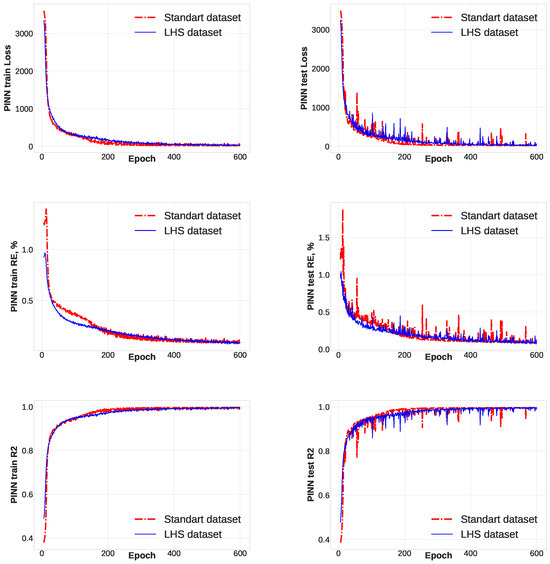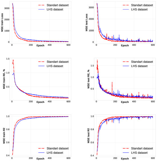 In the initial phase, a distinct superiority of the neural network trained on the standard dataset over its counterpart trained on the LHS dataset is evident. Figure 5 illustrates the convergence trajectories of these FFNNs. The RE value of the neural network trained on the standard dataset converges to a range of 8–10%, whereas the RE value of the neural network trained on the LHS dataset converges to 10–13%. Both neural networks converge to a high R2 value (Figure 5 bottom left, bottom right), approaching unity; however, the convergence rate of the neural network trained on the standard dataset is notably higher. At this juncture, the interim inference can be made that, when utilizing MSE as the loss function, the convergence of the neural network trained on the standard dataset surpasses that of the neural network trained on the LHS dataset. It is plausible that achieving comparable convergence with MSE would necessitate augmenting the size of the LHS dataset to at least match that of the standard dataset.