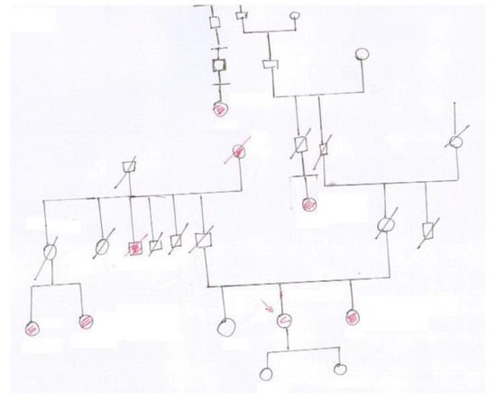 - Bennett, R.L.; Steinhaus, K.A.; Uhrich, S.B.; O’Sullivan, C.K.; Resta, R.G.; Lochner-Doyle, D.; Markel, D.S.; Vincent, V.; Hamanishi, J. Recommendations for Standardized Human Pedigree Nomenclature. J. Genet. Couns. 1995, 4, 267–279. [Google Scholar] [CrossRef] [PubMed]