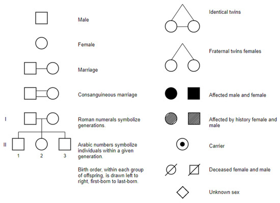 - Steinhaus, K.A.; Bennett, R.L.; Resta, R.G.; Uhrich, S.B.; Doyle, D.L.; Markel, D.S.; Vincent, V.A. Inconsistencies in Pedigree Symbols in Human Genetics Publications: A Need for Standardization. Am. J. Med. Genet. 1995, 56, 291–295. [Google Scholar] [CrossRef]