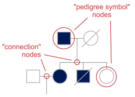 This step consists of modeling the pedigree chart by the automatic reconstruction of the relationships between pedigree symbols, edges, and text parts (how are symbols connected by the lines? Where do lines intersect? To which symbol or line segment is each part of text logically connected?). The result will be an undirected graph encoding the family pedigree, where the nodes are the pedigree symbols or correspond to junctions between lines (see Figure 3 for the details), the edges represent family relationships, and both nodes and edges have convenient attributes storing the details of the relationships between family members. Proximity check and rule-based algorithms will be used to establish the relationships between symbols, edges, and text.