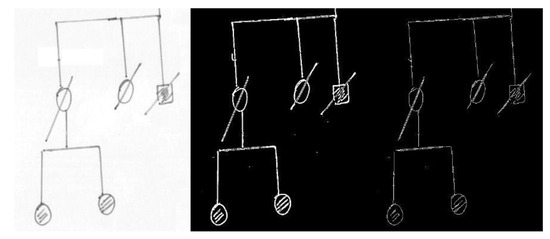 Example of preprocessing, from the original document scan (left), to the image obtained by an adaptive threshold filter (center), and finally to the skeletonized diagram (right). Some lines, in particular the oblique segments, appear as double after skeletonization because of the particular pen used, and give origin to double lines after the Hough transform. The defect is removed with line merging (see text and Figure 5 and Figure 6).