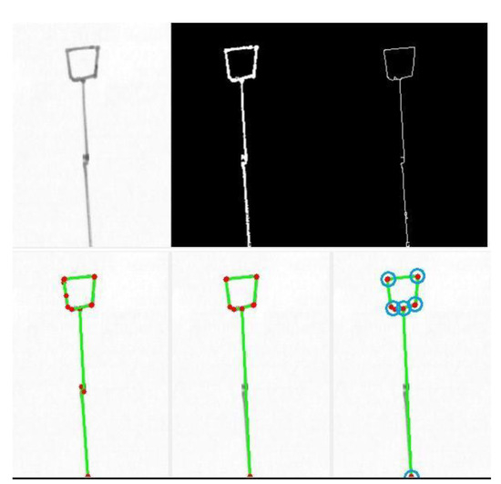 Example of preprocessing (top row) followed (bottom row) by the Hough transform for straight line segment detection (left; detected lines in green, endpoints in red), line merging (center; some lines were merged so that now only the essential five segments survive), and connection locating (right; found connections in blue).