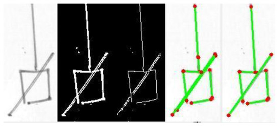 Then, we worked on line segments and, consequently, squares/rectangles. The Hough transform in OpenCV was used to find all the “straight” line segments. The algorithm was sensitive and found all the segments in the diagram, with much redundancy and with defects (fragmented or multiple segments). The problem of redundancy and the presence of defects were solved by implementing line merging [48] which was used to collapse similar segments into one, where similarity was defined in terms of tolerances in the angle and distance between the segments, both for overlapping and non-overlapping lines. After line merging, connections between the endpoints of different segments were found by simply locating the pairs of endpoints close to each other according to a defined threshold. On the other hand, connections between a segment endpoint and an internal point of another segment were also searched for, by assessing the closeness of the endpoint to each of the points of the segment, computed by Bresenham’s line algorithm. The two types of connections were labeled in a different way, as the distinction is useful for structure analysis. See Figure 5 and Figure 6 for two examples of line detection, line merging, and connection assessment.