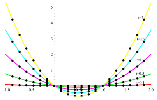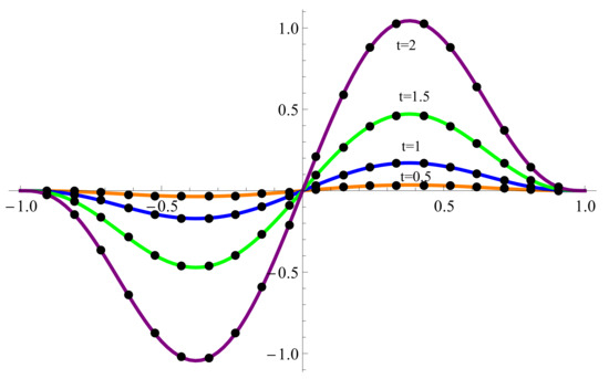 We can derive IC and BCs from the exact solution . Table 4 represents contrast of the absolute error of proposed scheme with RCBS [59] for , , and . norm is demonstrated in Table 5 for distinct values of and t for and . The exact and computational solutions are presented graphically in Figure 5 for , , and . Three-dimensional plot of exact and numerical solutions is shown in Figure 6.