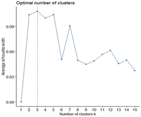 In view of these data (K-means algorithm and Elbow method), a second method called Silhouette was applied to verify the results. Although Silhouette is very similar to Elbow, the difference lies in the fact that the average of the coefficients or Silhouette indices of all the observations of individuals is maximized (Figure 2). Therefore, the results obtained from the Silhouette curve show a definitive number of three optimal clusters representing the best separation of the data, which reaffirms what was already visualized in the previous outputs.