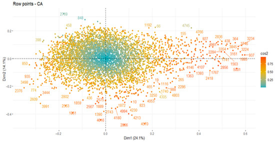 Based on the results in Table 2, the first two dimensions expressed 38.19% of the total inertia of the dataset. This means that the total variability in the row (or column) cloud is explained by the 1:2 plane. Obviously, this is an intermediate, though substantial, percentage for these data. The first plane represents a part of the variability in the data, which is much larger than the reference value (7.45% equal to the 95th percentile of the distribution of inertia percentages obtained by simulating 101 tables of data of equivalent size on the basis of a uniform distribution). Based on these figures, the variability explained by this plane is very important.