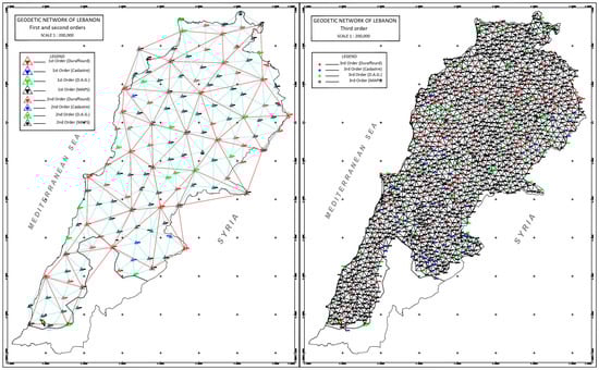 Different orders of the Lebanese geodetic network (1st and 2nd order networks at the left, and 3rd order network at the right).