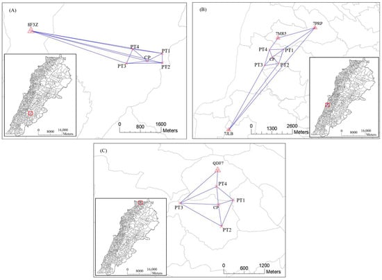 Topcon Hiper-V GNSS receivers with their controllers were used for measuring geodetic heights. Tripods and tribraches have been used to set up the receivers over the points. The instrument height was measured twice at the beginning and the ending of each session using a regular measuring tape. During each session, four satellite receivers were positioned and operated for a duration of one hour. This duration allows for sufficient satellite signal acquisition and data collection for precise positioning. Figure 3 shows the distribution of points in each zone. All GNSS measurements started from a chosen reference point from second- and third-order networks in each study area. In (A), the reference point 8F3Z from the third-order network was allocated. A1–4 are the ancillary points that formed a quadrant with a central point CP. The created baselines between these points were measured starting from 8F3Z. The same procedure was followed in zone (B), where three available control points in the region were allocated, and measurements were carried out based on them. The control points 7MR5, 7JLB, and 7PRP are from the third-order network. However, in zone (C), the chosen control point was QDF7 from the second-order network.