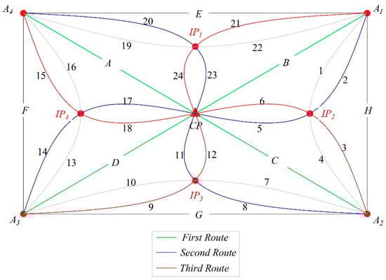 Normal heights are usually determined by the geometric levelling method, which is verified by taking measurements in two directions: forward and backward. However, the uneven distribution of the Earth’s mass leads to an uneven gravitational field, which affects the waviness of the geoid [19,20,21]. This may appear in different values during the geometric levelling measurements along different routes. If the values turn out to be the same, then the gravitational field in the area of study can be considered negligible. To determine whether there are noticeable changes due to gravitational forces, measurements are taken between the baselines along three different routes, and then the elevation differences are compared. The process of measuring heights through the three different routes (one straight route and two curvilinear routes) occurs between two main points, passing through an intermediate point in each followed curvilinear route (Figure 4). For example, the points A1 and CP are measured three times, where back sight and fore sight readings are taken along the first route (straight: baseline-B), then along the second route (curvilinear: baselines 2 and 5) passing through the intermediate point IP2, and then along the third route (curvilinear: baselines 21 and 24) passing through IP1. The same process is followed for other points. This process helps in estimating the gravitational influence in the area by comparing the values of the measured heights in each route.