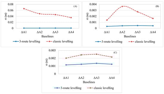 Comparison of the standard deviation of heights calculated using both the classical and three-route levelling methods at the three zones (A, B, and C).