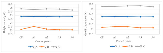 Comparison between quasi-geoid heights (ζ) derived from Normal-Geodetic heights and geoid heights (N) derived from the EGM2008 model in the three zones (A, B, and C).